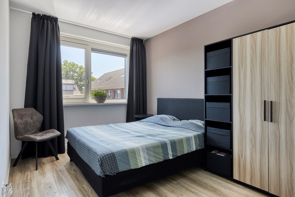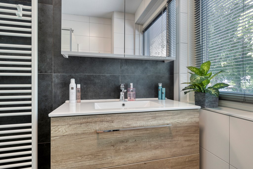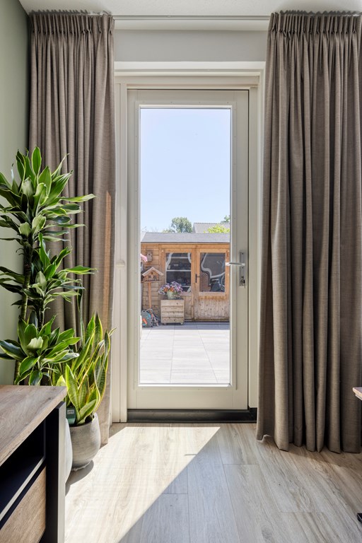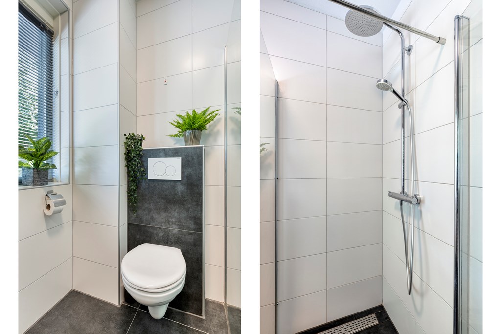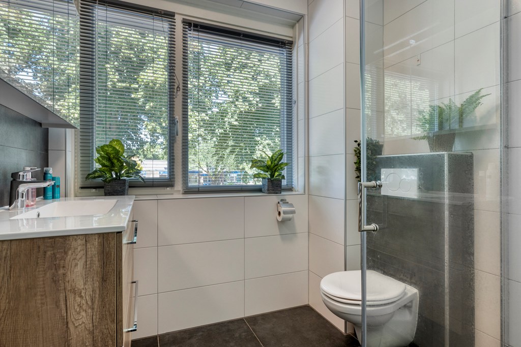 Eerste verdiepingEen vaste trap in de woonkamer brengt u naar de eerste verdieping, waar drie slaapkamers en de badkamer zijn gelegen. Deze woonlaag biedt volop ruimte voor een gezin of thuiswerkopstelling, met een prettige indeling en aangename lichtinval. Elke slaapkamer is bereikbaar via de overloop en biedt voldoende ruimte voor een bed, bureau of kast. Dankzij de grote ramen genieten alle kamers van natuurlijke lichtinval, wat bijdraagt aan een rustige en prettige sfeer. Eén van de slaapkamers beschikt bovendien over een ingebouwde kast, wat extra opbergruimte geeft zonder concessies te doen aan de leefruimte. De kamers zijn ook uitstekend te gebruiken als werkkamer of hobbyruimte. De moderne badkamer is stijlvol betegeld en praktisch ingedeeld. Hier vindt u een ruime douche met glazen wand, een zwevend toilet, een wastafelmeubel en een handdoekradiator. Alles is netjes afgewerkt en biedt u het comfort dat u dagelijks nodig heeft.