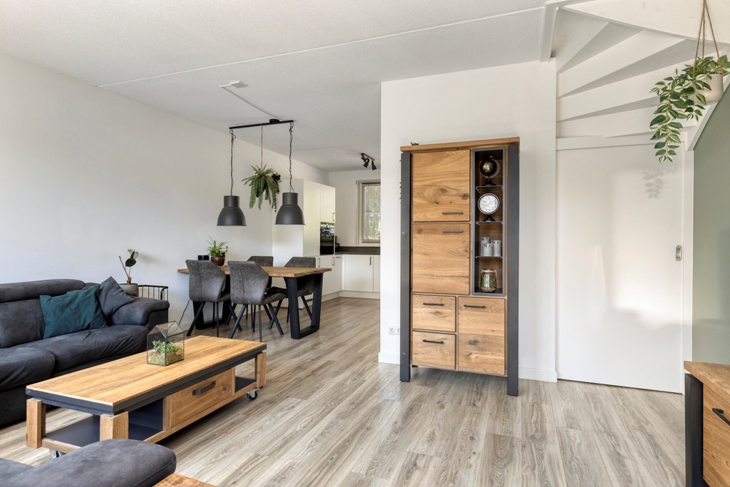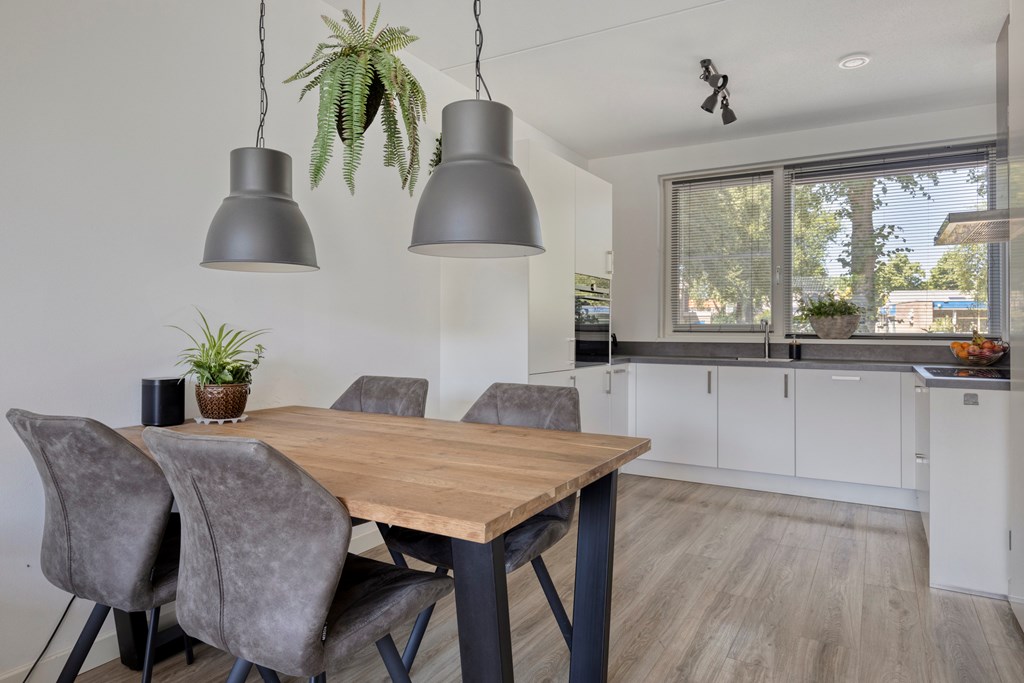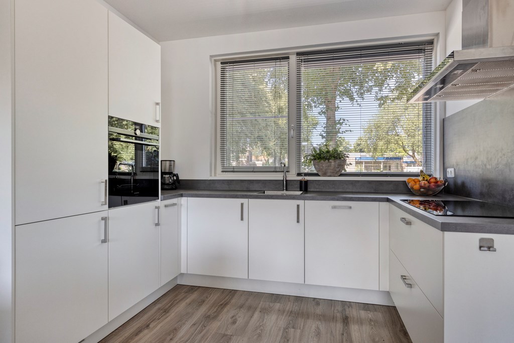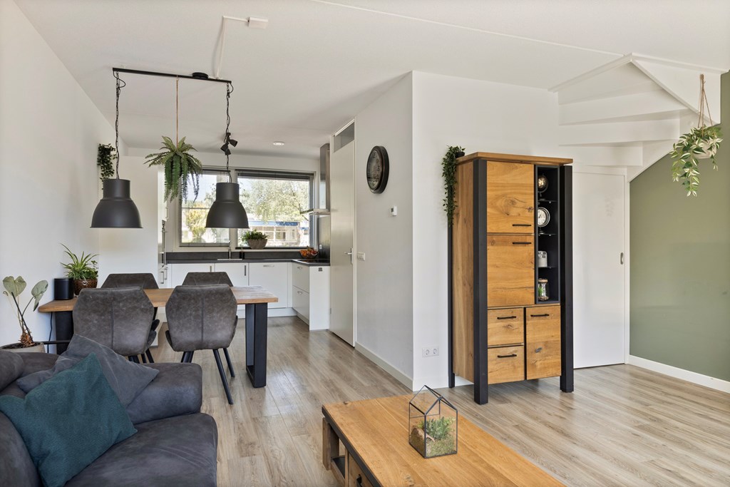 IndelingEen goed onderhouden voortuin leidt u naar de entree van de woning, waar u binnenkomt in de verzorgde hal. Deze ruimte is niet alleen een uitnodigende binnenkomst, maar biedt ook praktisch comfort. Er is voldoende plek voor een kapstok of klein opbergmeubel en vanuit hier heeft u toegang tot de toiletruimte, de trapopgang naar de eerste verdieping en uiteraard de woonkamer. Een slimme indeling die sfeer en functionaliteit combineert. De woonkamer voelt dankzij de grote raampartijen licht en open aan, met veel ruimte voor het inrichten van een comfortabele zithoek en een gezellige eethoek. De overvloed aan daglicht laat de ruimte nog groter aanvoelen en creëert een aangename woonbeleving. Een handige trapkast biedt extra opbergruimte en via de tuindeur bereikt u moeiteloos het zonnige terras aan de achterzijde. Een royale open keuken bevindt zich aan de voorzijde van de woning. De keuken is uitgevoerd in een praktische U-opstelling en biedt volop werk- en opbergruimte. Met een inductiekookplaat, afzuigkap, oven, koelkast, vaatwasser, Quooker en spoelbak is het een complete en nette keuken, waar koken een plezier wordt. Dankzij het grote raam kijkt u hier uit over de voortuin terwijl u bezig bent in de keuken.