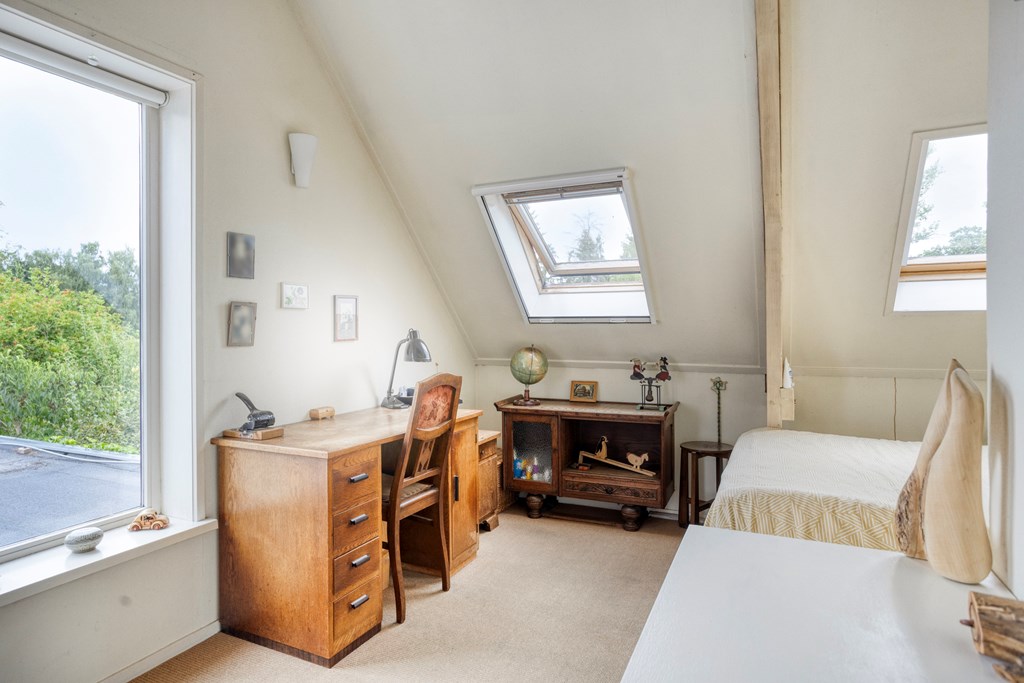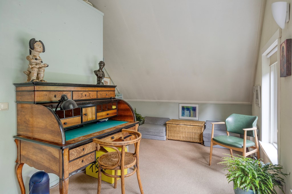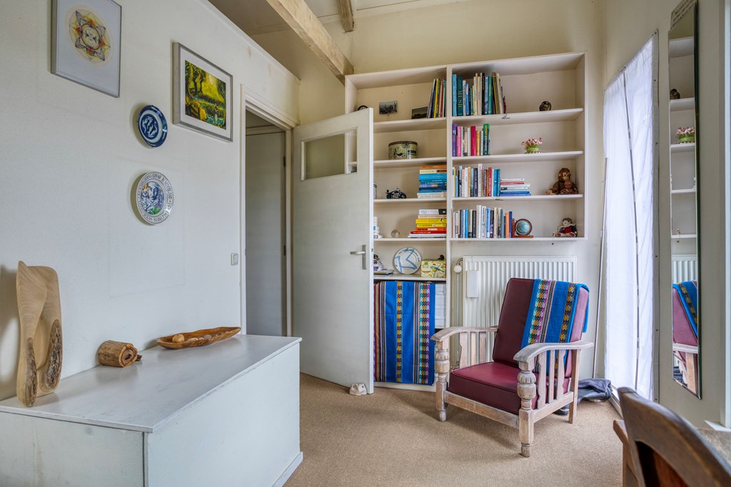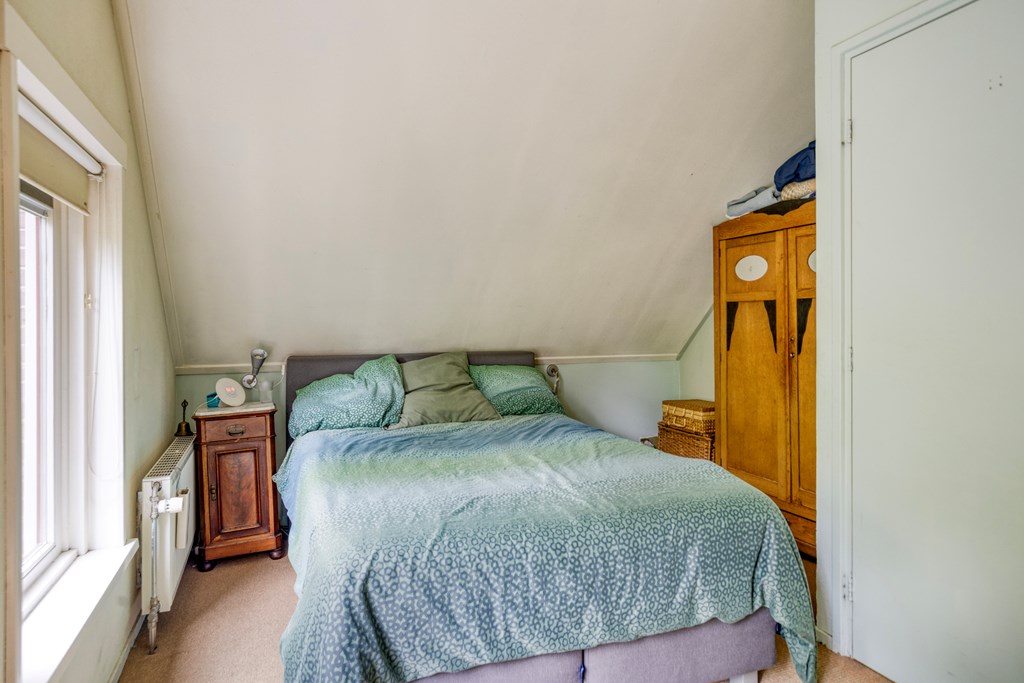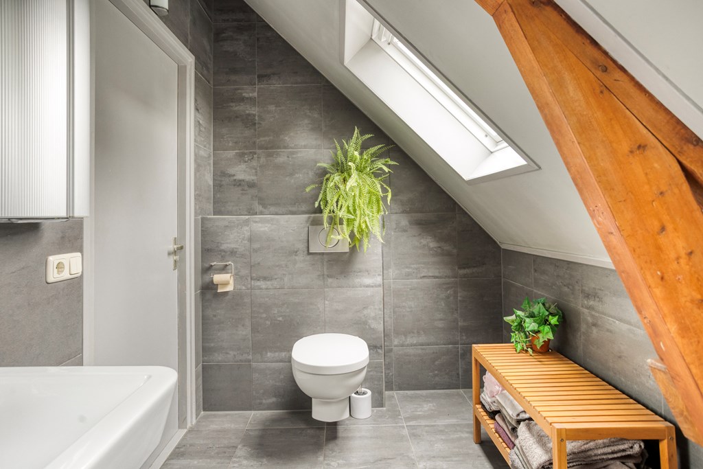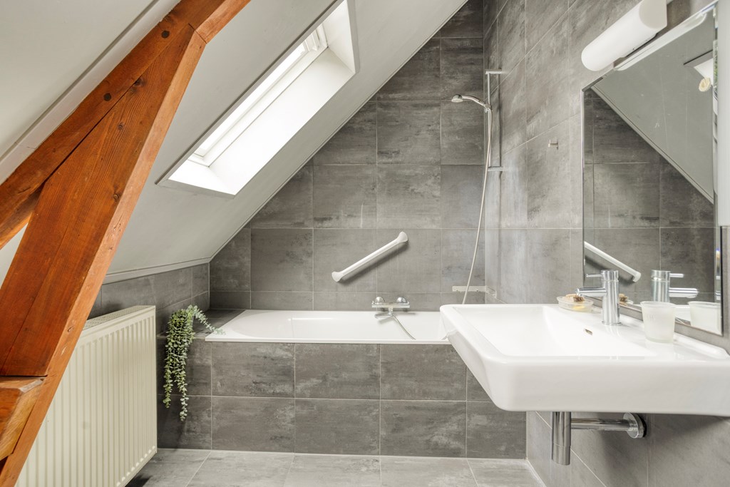 Eerste verdiepingBoven zijn nog twee volwaardige slaapkamers; beide zijn ruim, met fraaie oorspronkelijke spanten en veel lichtinval. De overloop is ruim en verbindend. De badkamer op deze verdieping is fraai gemoderniseerd, met betonlook wand- en vloertegels, een ligbad met douchemogelijkheid, een wastafel, wandcloset en een dakraam voor natuurlijke ventilatie en daglicht. Ook hier maken de houten balken het geheel karakteristiek en warm.
