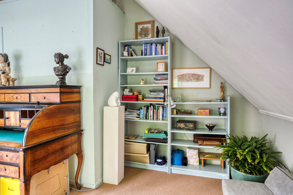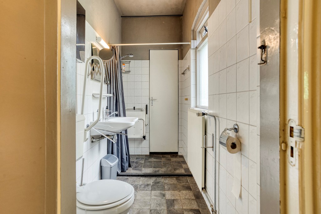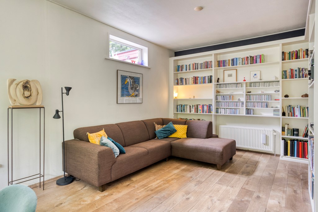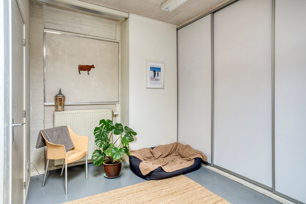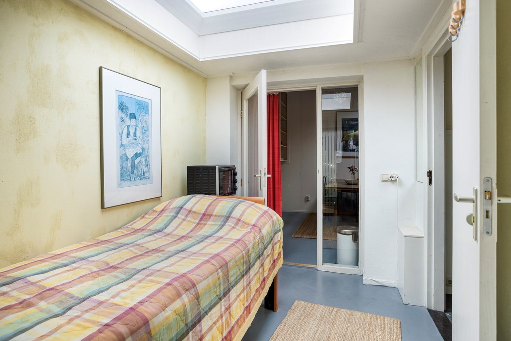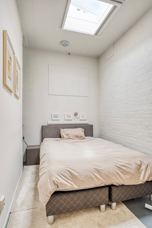 Eerste verdiepingBoven zijn nog twee volwaardige slaapkamers; beide zijn ruim, met fraaie oorspronkelijke spanten en veel lichtinval. De overloop is ruim en verbindend. De badkamer op deze verdieping is fraai gemoderniseerd, met betonlook wand- en vloertegels, een ligbad met douchemogelijkheid, een wastafel, wandcloset en een dakraam voor natuurlijke ventilatie en daglicht. Ook hier maken de houten balken het geheel karakteristiek en warm.