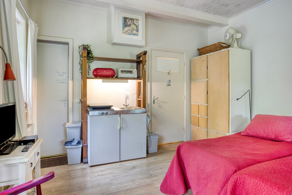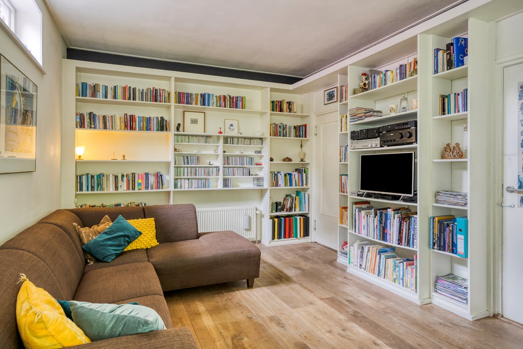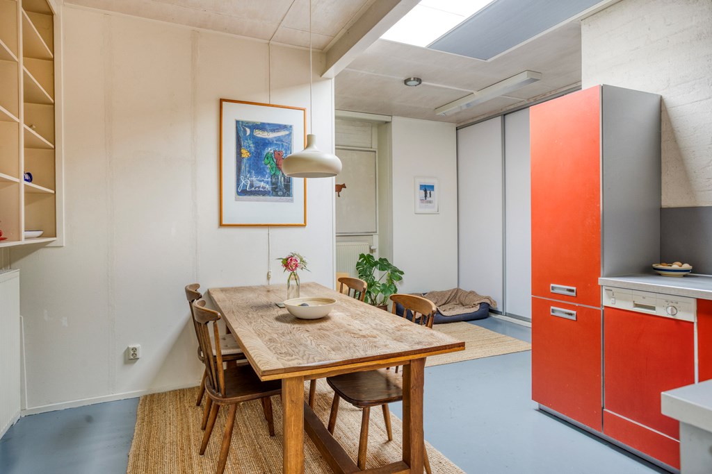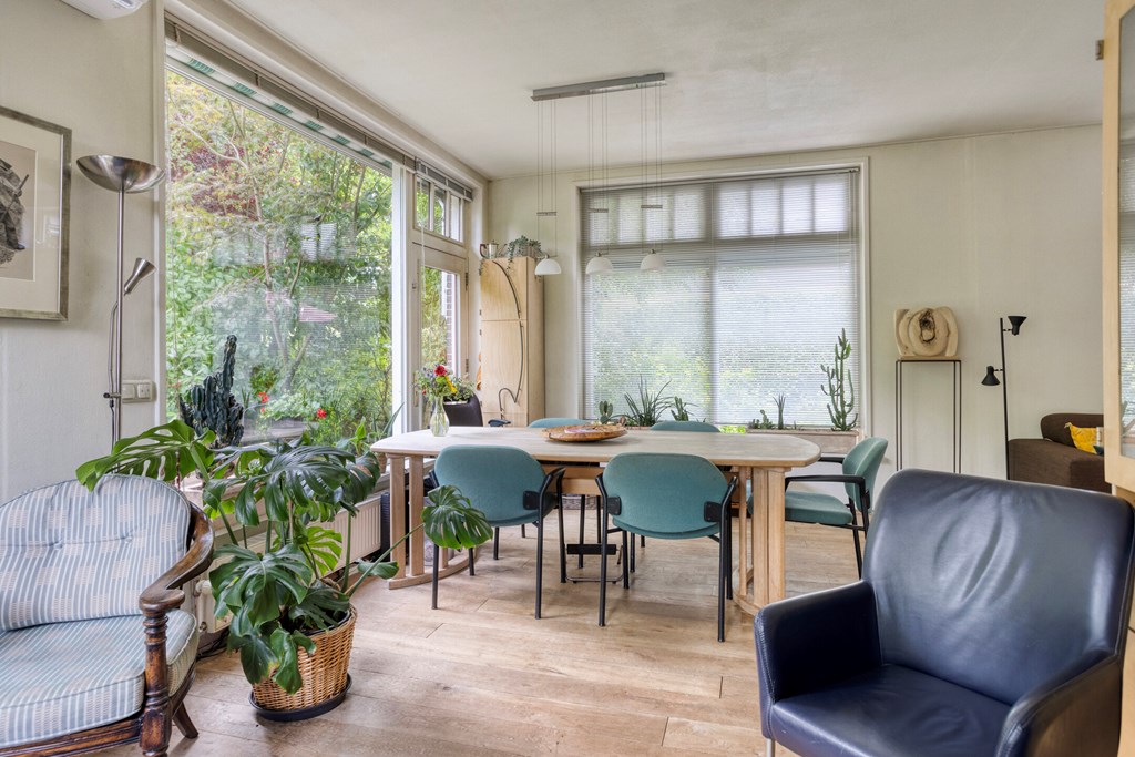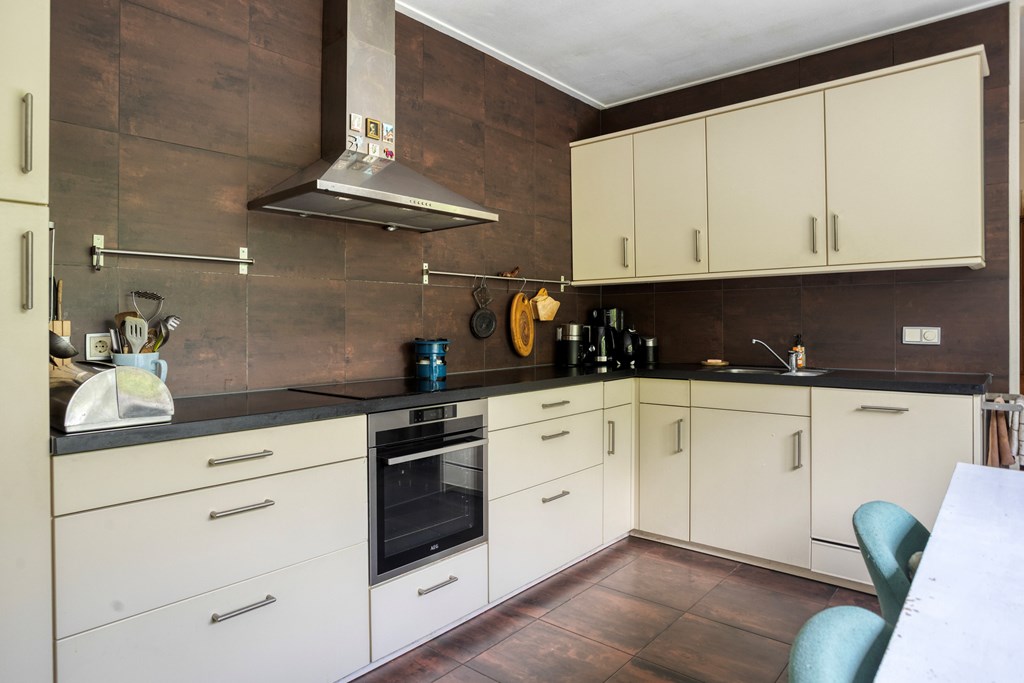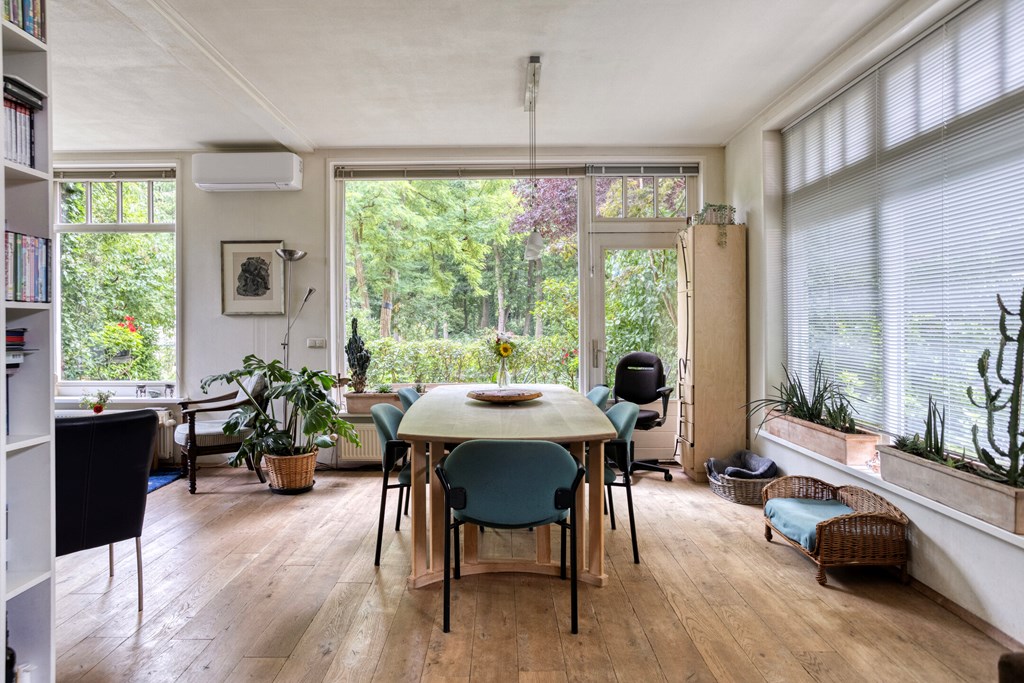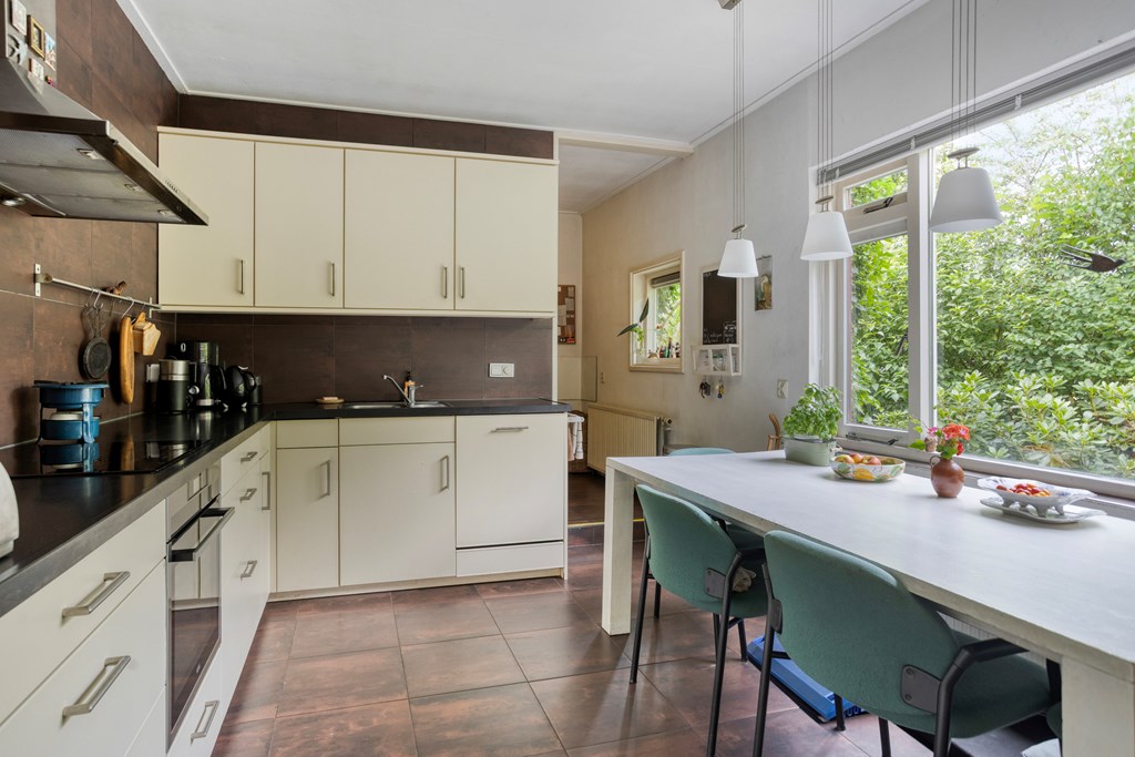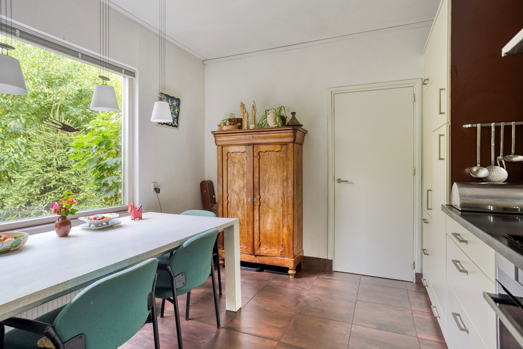 Je komt binnen in de ruime hal met een garderobe- en meterkast en om de hoek de trapopgang. Vanuit hier stap je de eerste woonkamer binnen: een grote gezellige ruimte met originele details en uitzicht op het groen rondom. Een heerlijke plek om met het gezin samen te komen of te duiken in een goed boek, terwijl je geniet van een drankje en de verkoeling van de airconditioning op warme dagen. Het gangetje naast deze woonkamer verleent toegang tot de bovenverdieping en de eerste keuken. Deze ruime keuken is ingericht met een licht hoekmeubel en diverse apparatuur, waaronder een recent geplaatste inductiekookplaat en oven, afzuigkap, vaatwasser en koelkast. Aangrenzend vind je de bijkeuken met witgoedaansluitingen en toegang tot een tussengang, die meerdere ruimtes van de uitbouw toegankelijk maakt. Aan de achterzijde ligt de riante uitbouw – een multifunctioneel deel met een tweede woonkamer, drie slaapkamers – waarvan twee met een badkamer en suite -, en zelfs een tweede keuken. Perfect voor dubbele bewoning, gastenverblijf of praktijk aan huis. De tweede keuken is ingericht met een hoekmeubel in een spicy kleur en voorzien van een gaskookplaat, afzuigkap, vaatwasser en koel-/vriescombinatie. De keuken heeft een heerlijk retro karakter.